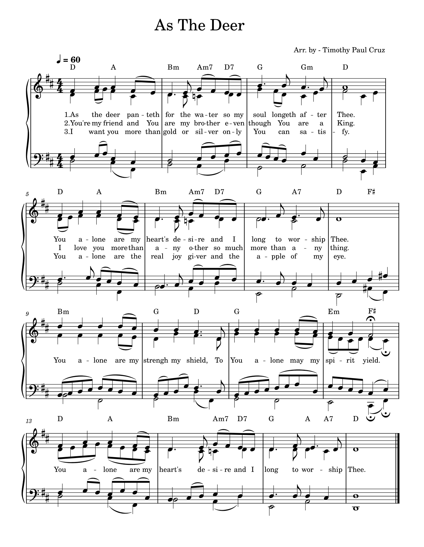 Musically, the hymn is often set in a gentle, flowing melody that mirrors the imagery of a deer approaching water, creating a reflective and serene atmosphere suitable for both congregational and personal worship. Its structure is repetitive and easy to follow, which reinforces meditation on the themes of spiritual thirst and fulfillment in God. “As the Deer” continues to inspire worshipers worldwide because it captures the universal longing for God’s presence, teaching that spiritual satisfaction is found not in worldly things but in communion with the Creator. Its enduring appeal lies in its combination of poetic imagery, scriptural truth, and melodic accessibility, making it a cherished piece in contemporary Christian hymnody.