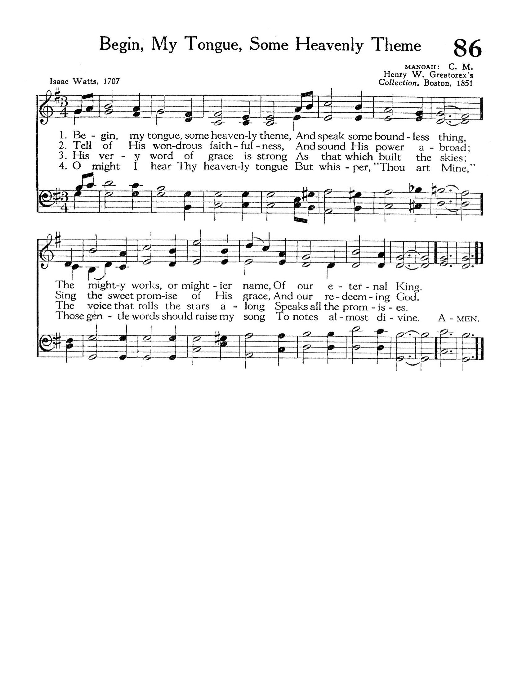 Isaac Watts’ hymn The Faithfulness of God, opening with “Begin my tongue, some heav'nly theme”, is a lyrical reflection on God’s steadfastness and unchanging character. Written in the early 18th century, Watts crafted this hymn to guide believers in praising God for His unwavering promises and mercies. The hymn encourages the worshiper to begin every act of devotion by acknowledging the reliability and constancy of God, emphasizing that all human life and spiritual blessings are secured by His faithfulness.