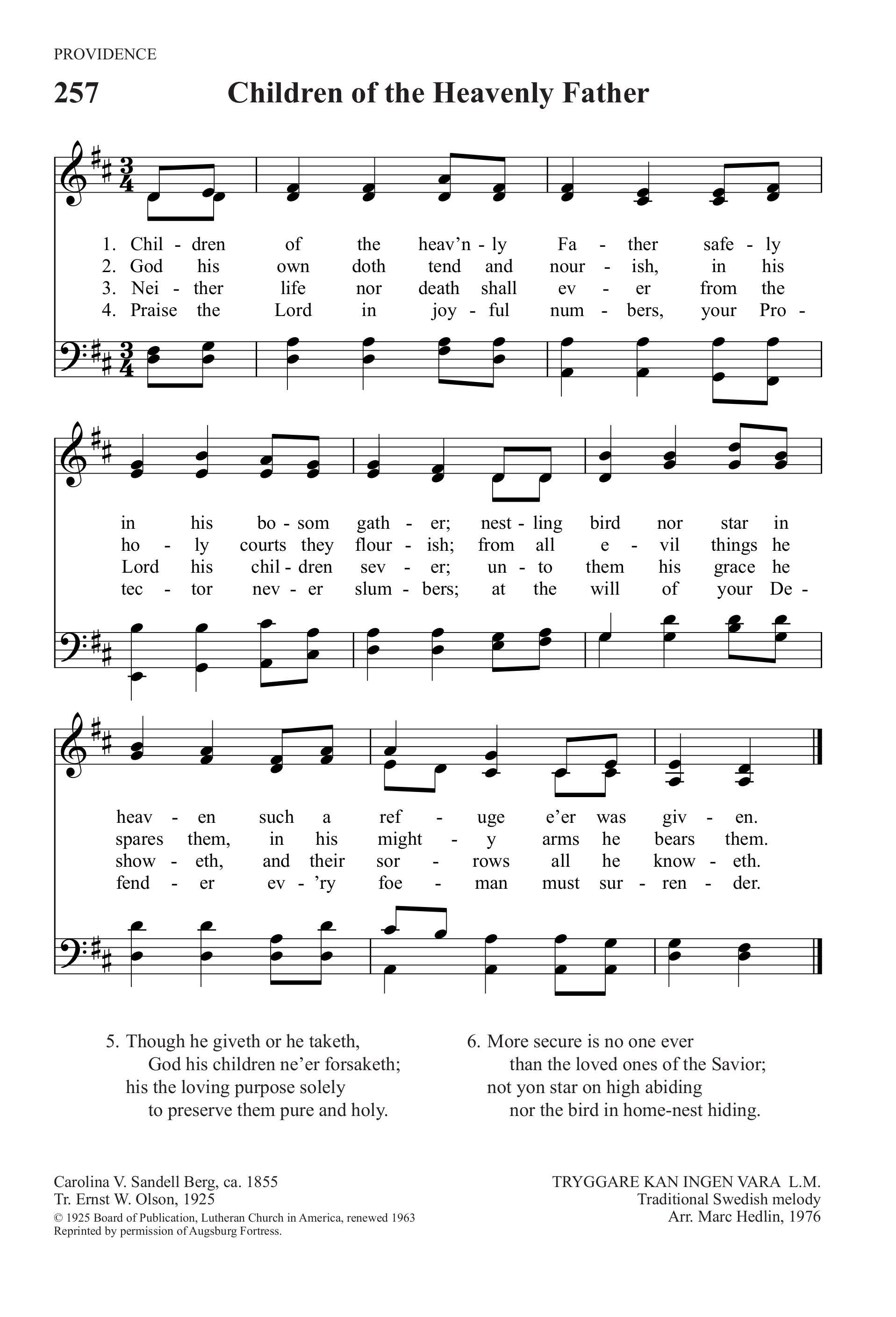 Carolina Sandell lifts the worshipper’s mind to see the Father’s care in both joy and hardship. Nothing happens outside His knowledge, and nothing can separate His children from His love, a truth that reflects the words of Jesus in John 10 where He promises that no one can pluck His sheep out of His hand. Because of this certainty the hymn encourages a calm and trusting spirit that relies fully on God’s goodness.