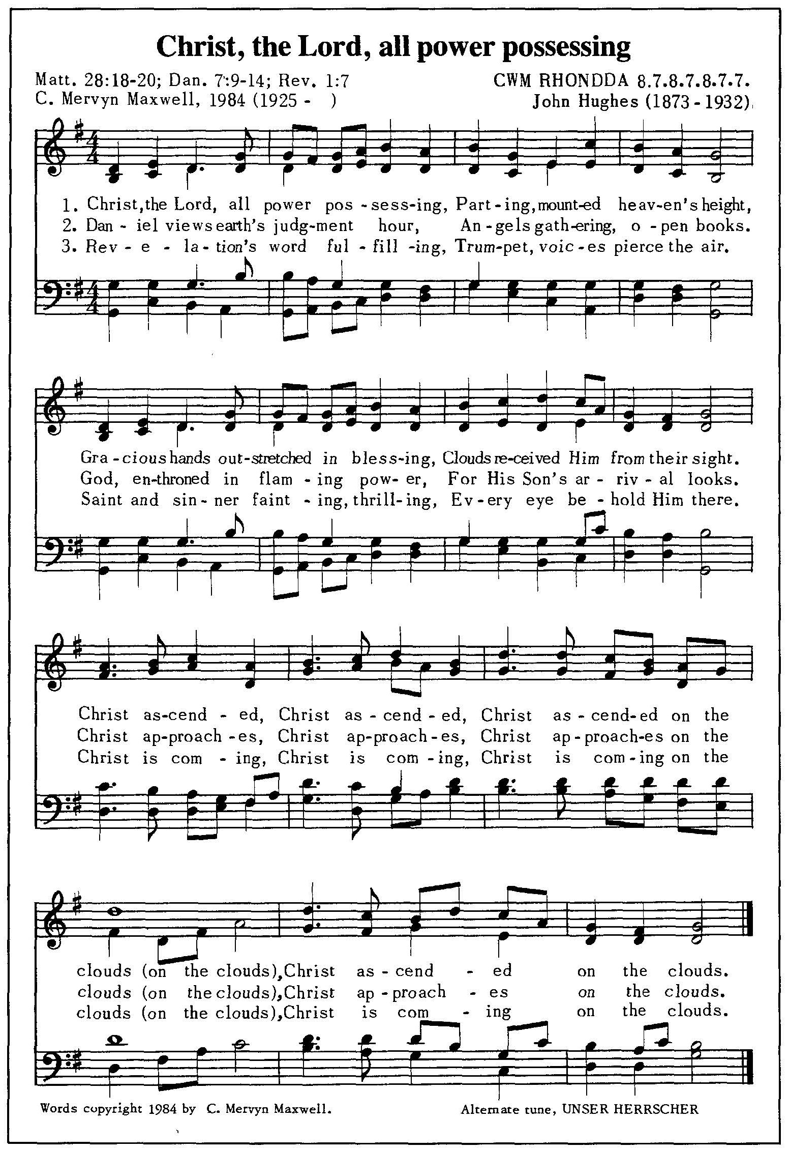 “Christ the Lord, All Power Possessing” is a hymn that lifts the mind to the risen and ascended Savior, who now reigns in heavenly authority. Maxwell wrote this text to help worshippers reflect on the majesty of Christ as He rose from the earth and returned to the glory of the Father. The hymn begins by pointing to the moment of the ascension, when Christ blessed His disciples, rose into the clouds, and entered the presence of God. This scene forms the foundation of the hymn, reminding believers that the Lord who died and rose again now possesses all power in heaven and on earth. His ascension is presented as a triumph that confirms His victory over sin and death.
