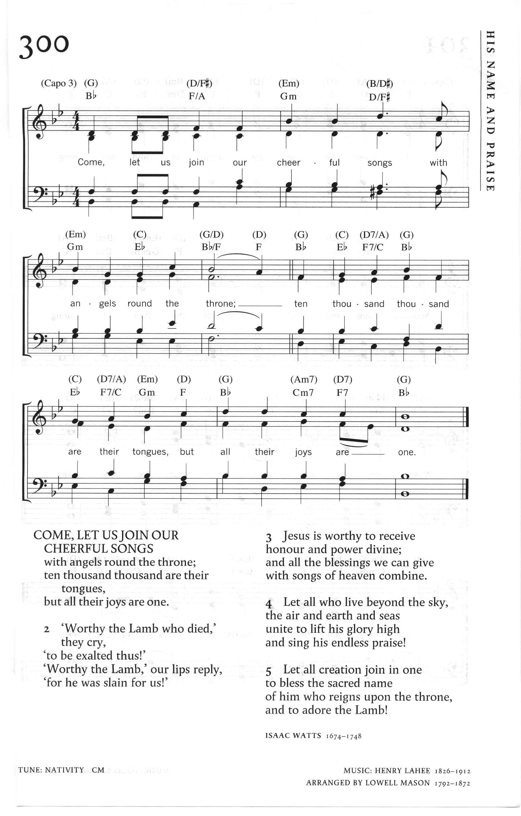 This hymn by Isaac Watts is a vibrant invitation to unite in joyful praise with the heavenly host. Drawing inspiration from Revelation chapter five, where countless angels surround the throne and proclaim the worthiness of the Lamb, Watts encourages believers to lift their voices in harmony with that vast chorus. The hymn reflects his gift for taking biblical scenes and turning them into accessible congregational worship, helping ordinary Christians sing the language of Scripture with clarity and gladness.