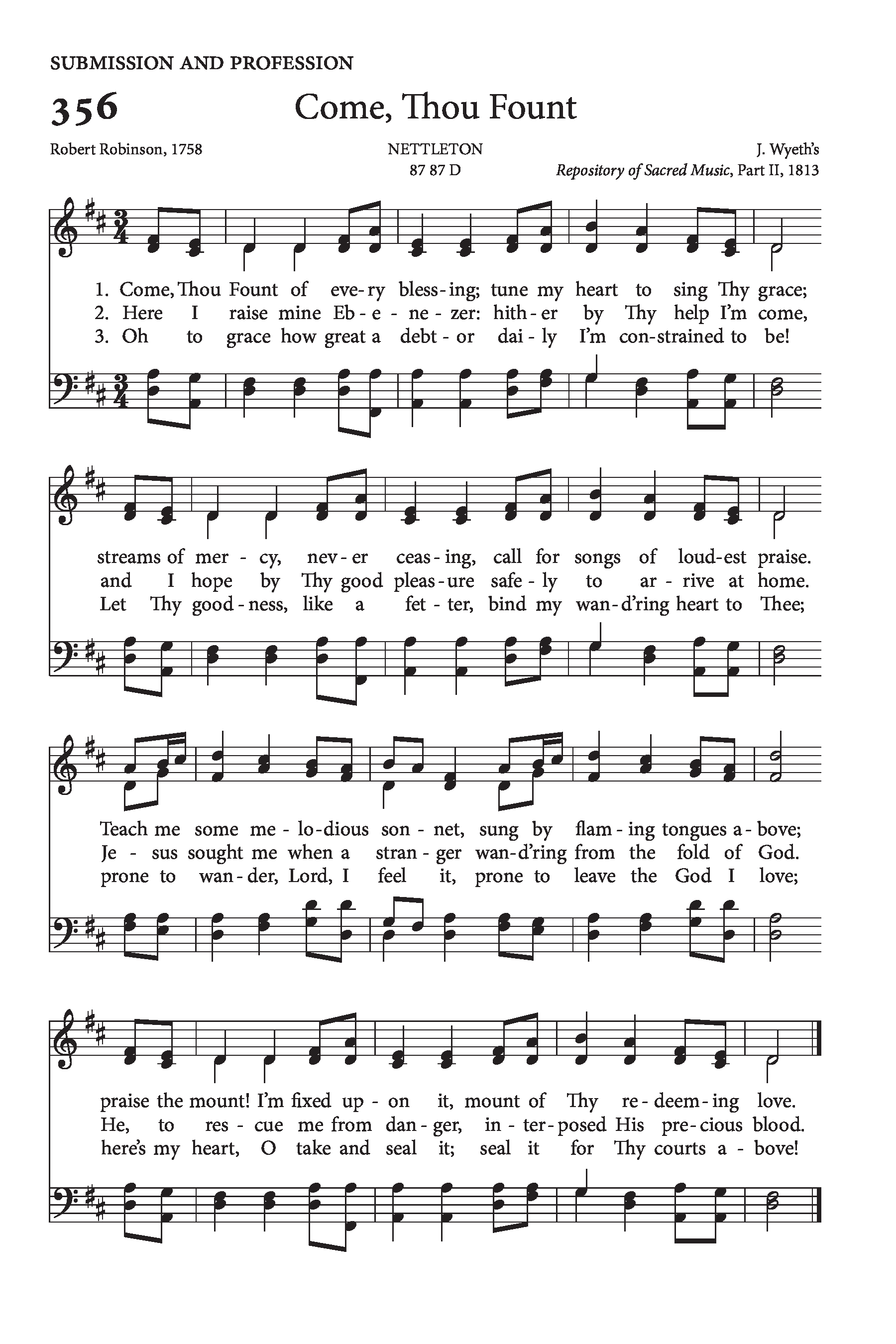 The tune most commonly associated with this hymn, known as Nettleton, was named after Rev. Asahel Nettleton, an American evangelist active during the early 19th century. The melody itself was composed by John Wyeth, a printer and lay musician born in Cambridge, Massachusetts, on March 31, 1770. Wyeth included the hymn in his influential hymnal, Wyeth’s Repository of Sacred Music, published in 1813. While Nettleton remains the most enduring musical setting, Come, Thou Fount can also be paired with other tunes written in the same 87.87 doubled meter, allowing for varied expression across different worship traditions. Despite the turbulence in Robert Robinson’s spiritual journey, his hymn continues to bless countless believers with its rich theology, heartfelt confession, and longing for divine grace.
