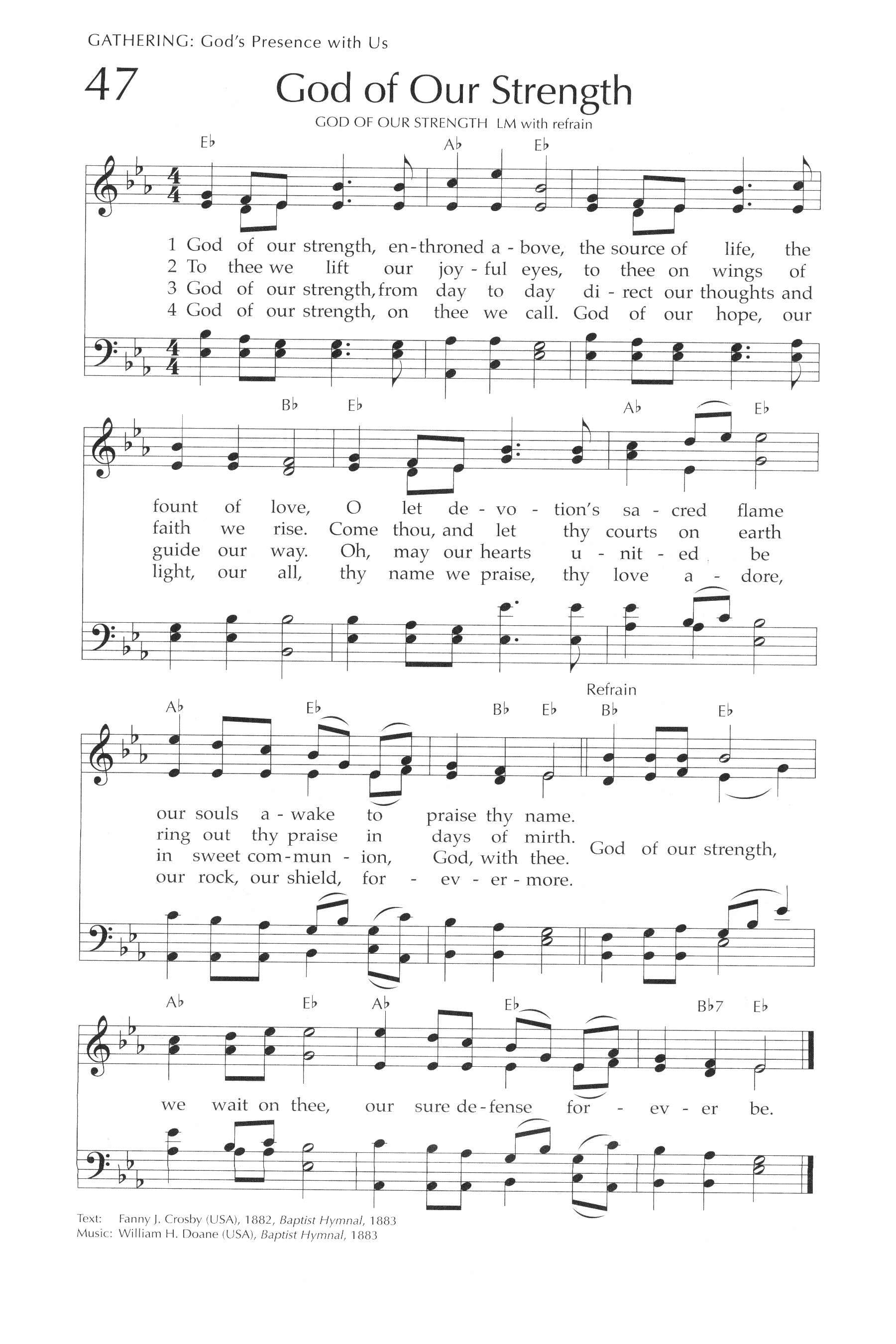 "God of Our Strength, Enthroned Above” is a hymn written by Fanny J. Crosby in 1872, reflecting her deep trust in God’s power and protection. Crosby, one of the most prolific hymn writers in Christian history, composed thousands of hymns that express personal faith, divine comfort, and the steadfastness of God’s promises. This hymn emphasizes God as the ultimate source of strength, reigning above all circumstances and providing security for His people.