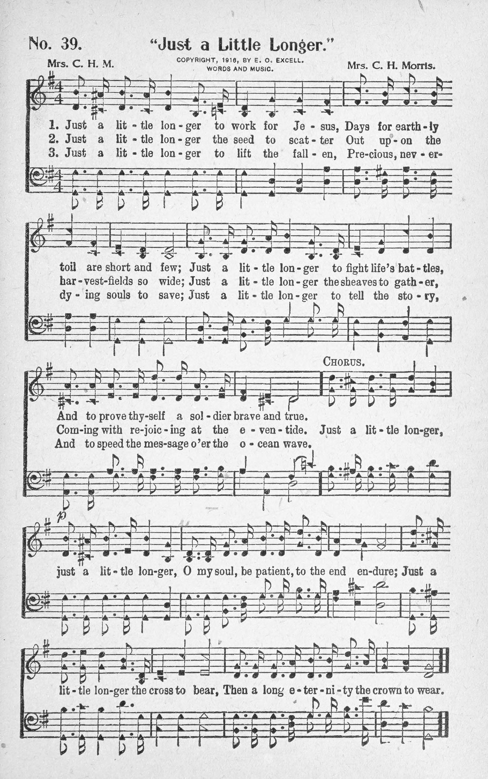 The repeated phrase “just a little longer” is both comforting and motivating. It reminds believers that the waiting period is temporary, and the glory to come is certain. The hymn’s tone is gentle but firm, urging steadfastness in the Christian walk. It reflects the early twentieth-century gospel emphasis on watchfulness, personal holiness, and evangelistic zeal in light of Christ’s imminent return.