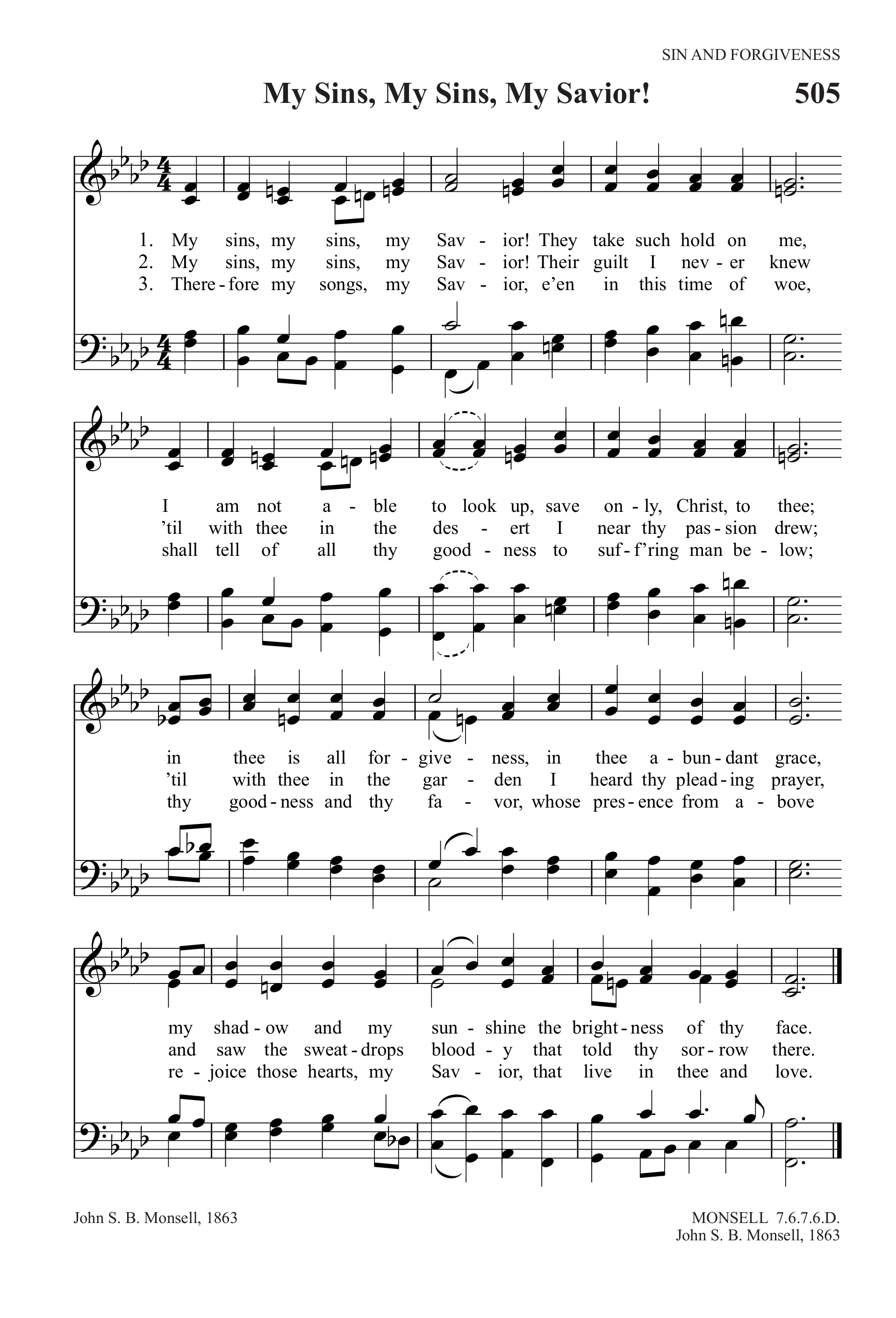 Structured with repeated emphasis on “My sins, my sins,” the hymn encourages deep personal reflection. It moves from acknowledgment of wrongdoing to celebration of divine mercy, inviting believers to experience both humility and gratitude. Its poetic phrasing and sincere tone make it particularly suited for personal devotion, altar calls, or moments of congregational reflection.