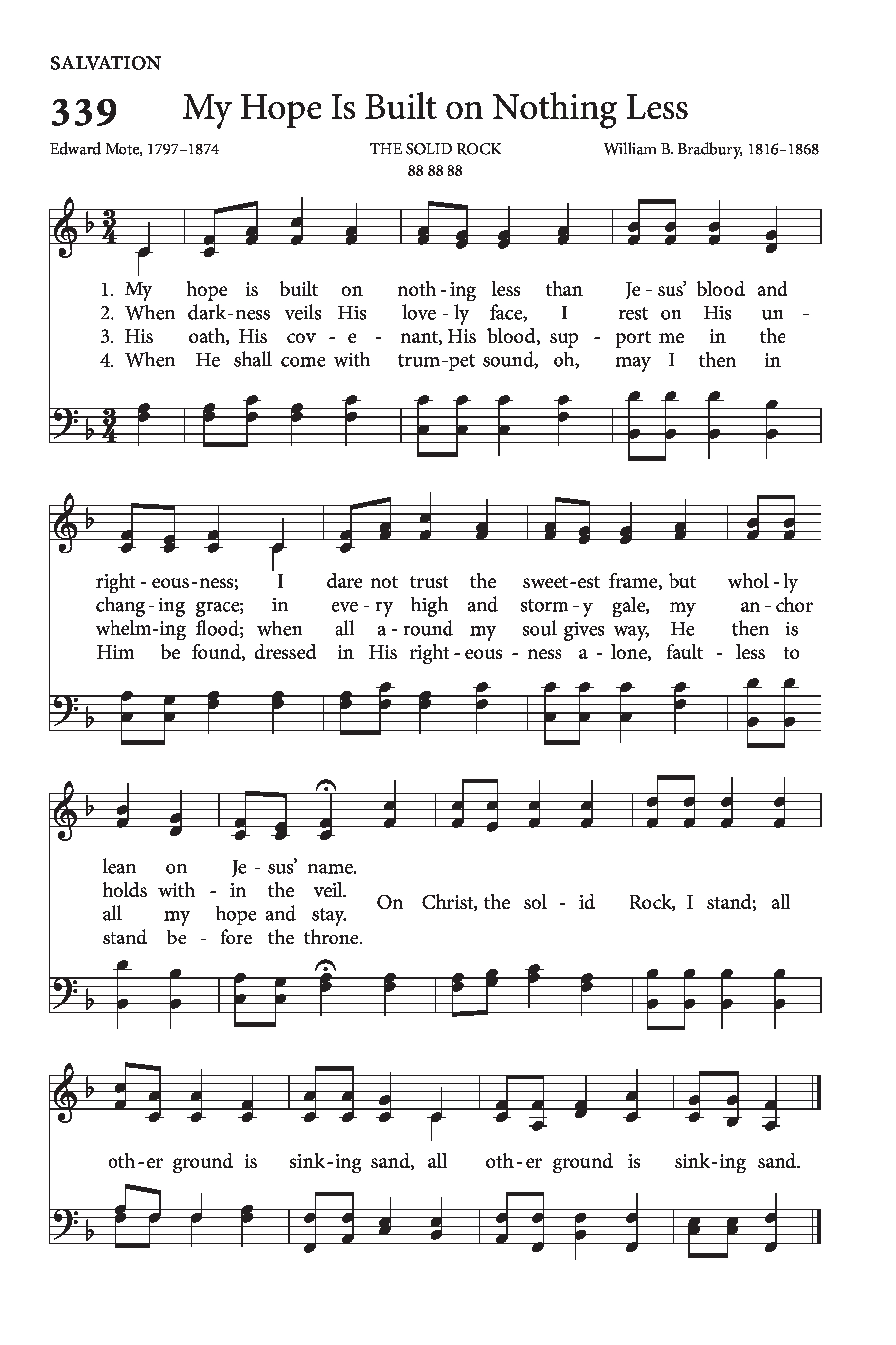 “My Hope Is Built on Nothing Less,” written in 1834 by Edward Mote, is one of the most enduring hymns on the believer’s confidence in Christ as the only foundation of salvation. Mote, who grew up in a non-Christian home and came to faith in adulthood, wrote these verses to encourage believers to trust fully in Christ rather than their own works or feelings. The text is rooted in biblical truths, echoing Jesus’ words in Matthew 7:24-27 about building one’s life on the solid rock. This hymn emphasizes that salvation and assurance rest solely on Jesus’ blood and righteousness, offering comfort and strength in times of trial.