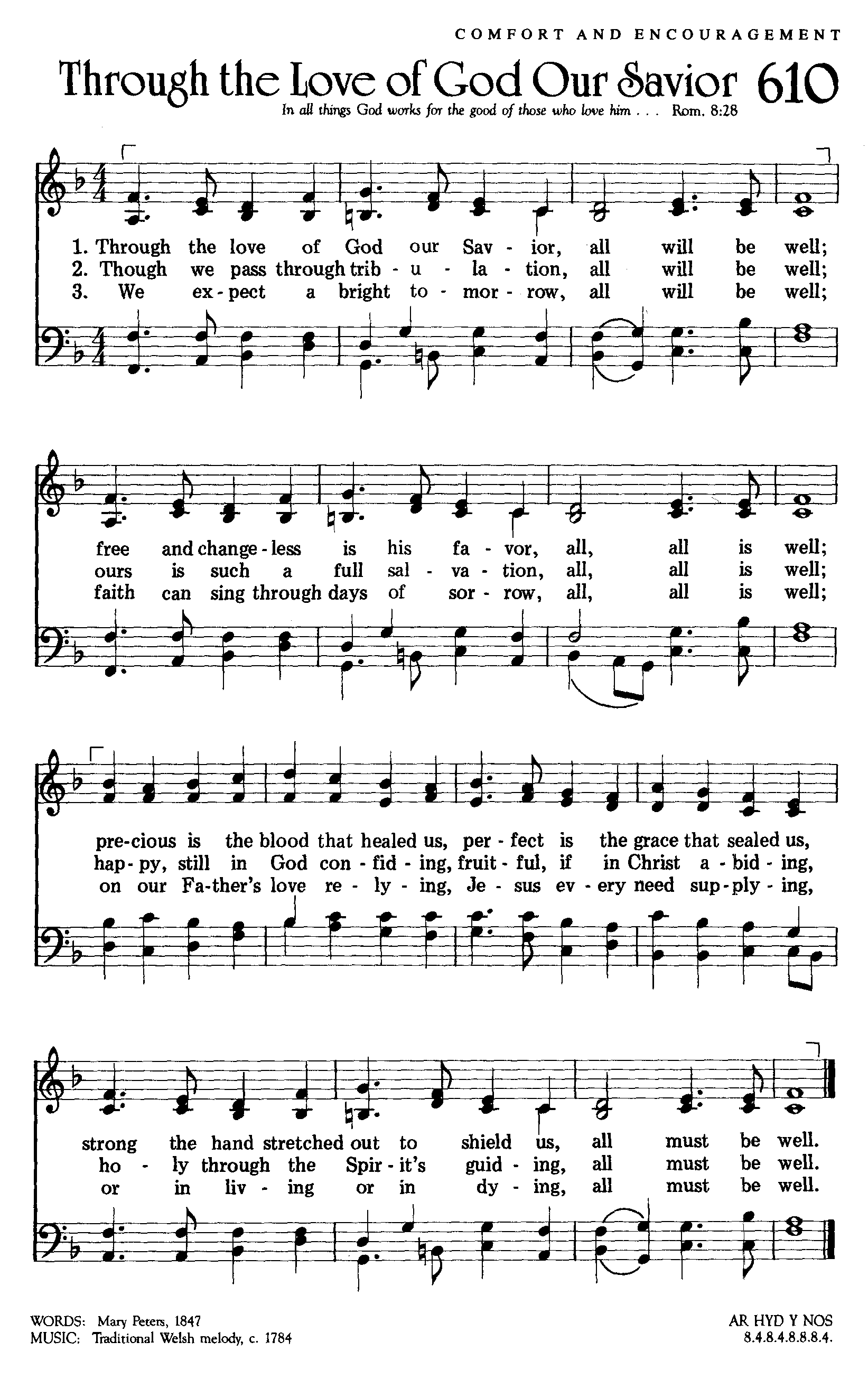 “Through the Love of God Our Savior” is a gentle hymn of confidence written by Mary Peters. It expresses the calm assurance that flows from trusting in the faithful care of the Lord. The hymn reflects the spirit of Jude 24 to 25, where believers are reminded that God is able to keep His people from falling and to present them faultless with great joy. Peters draws upon this truth to show that, because of the love of God revealed in Christ, the believer can face life with steady peace. The hymn is filled with the quiet strength that comes from knowing that God watches over His children and that His purpose for them cannot fail.