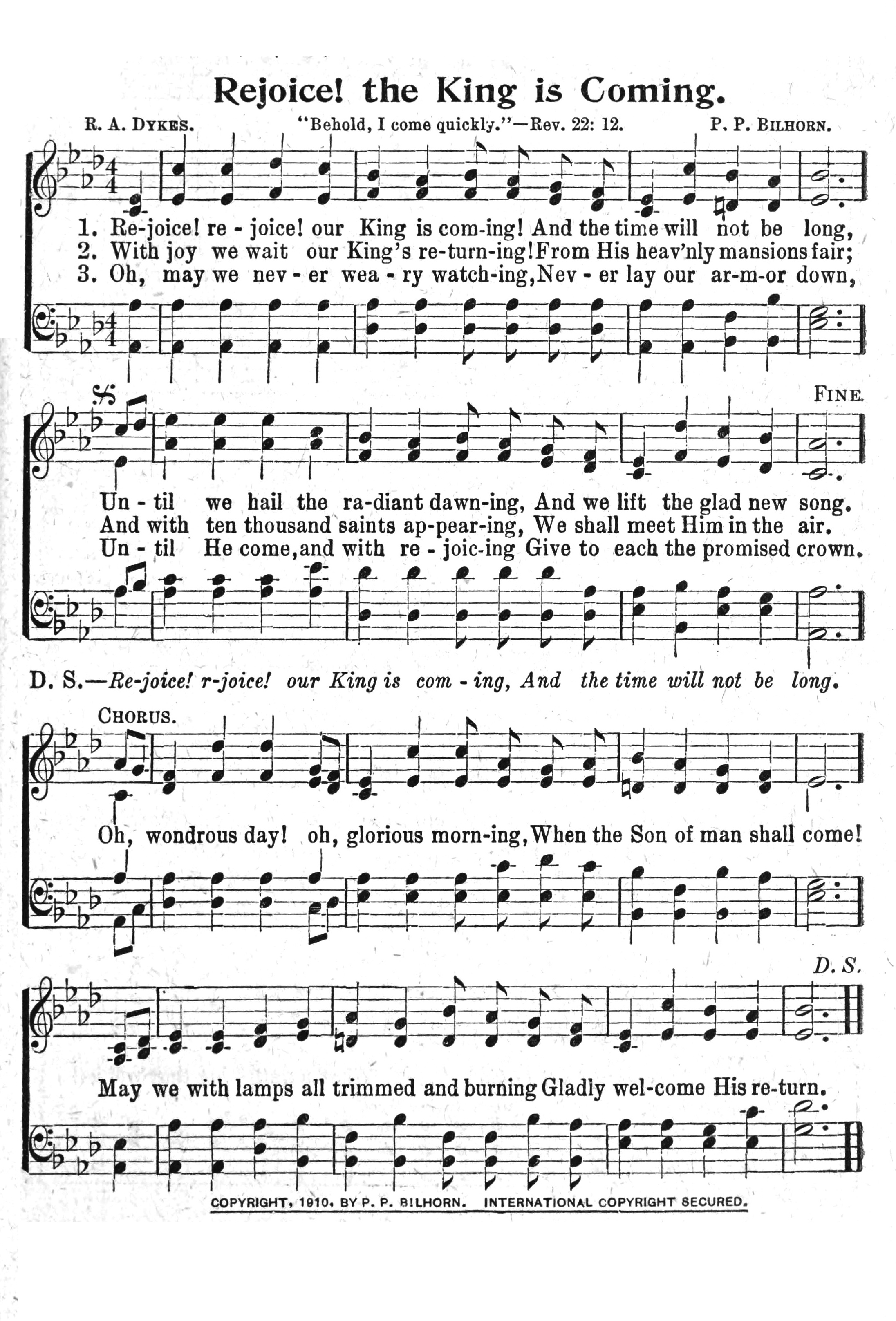 Musically, the tune “Rejoice! Rejoice! Our King Is Coming” was composed by Sankey in 1888. It has become widely used in evangelical hymnals and is considered part of Sankey’s legacy in gospel music. The melody supports the text’s hopeful and forward-looking character.