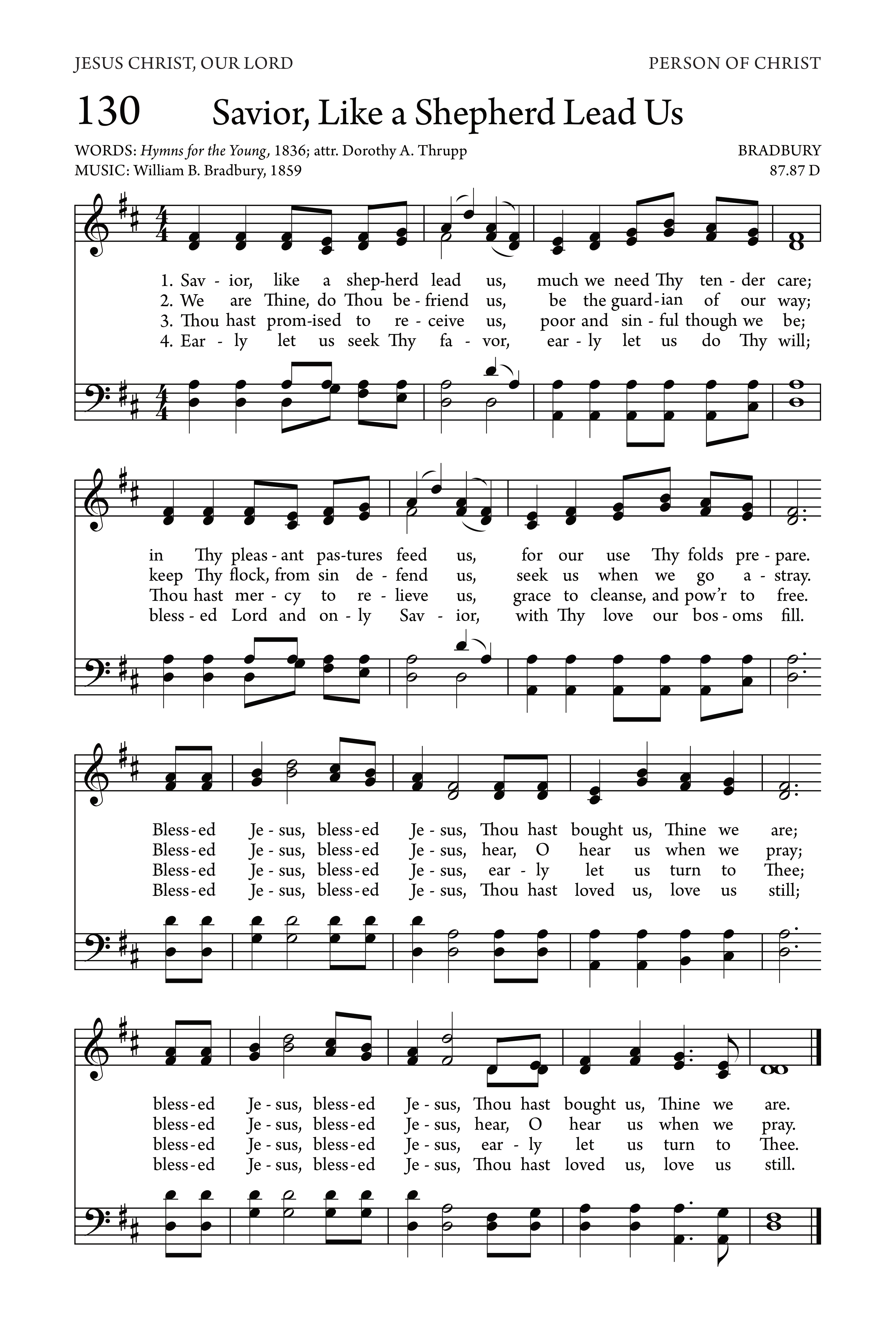Over the years, “Saviour, Like a Shepherd Lead Us” has become a staple in Christian worship. Its gentle prayerfulness has made it especially comforting in times of sorrow, as well as deeply meaningful in regular congregational singing. Paired with William B. Bradbury’s music, the hymn continues to invite worshippers into a deeper trust in Christ’s leading. Though originally written for the young, its universal message reminds all believers of their constant need for the Shepherd’s tender care.