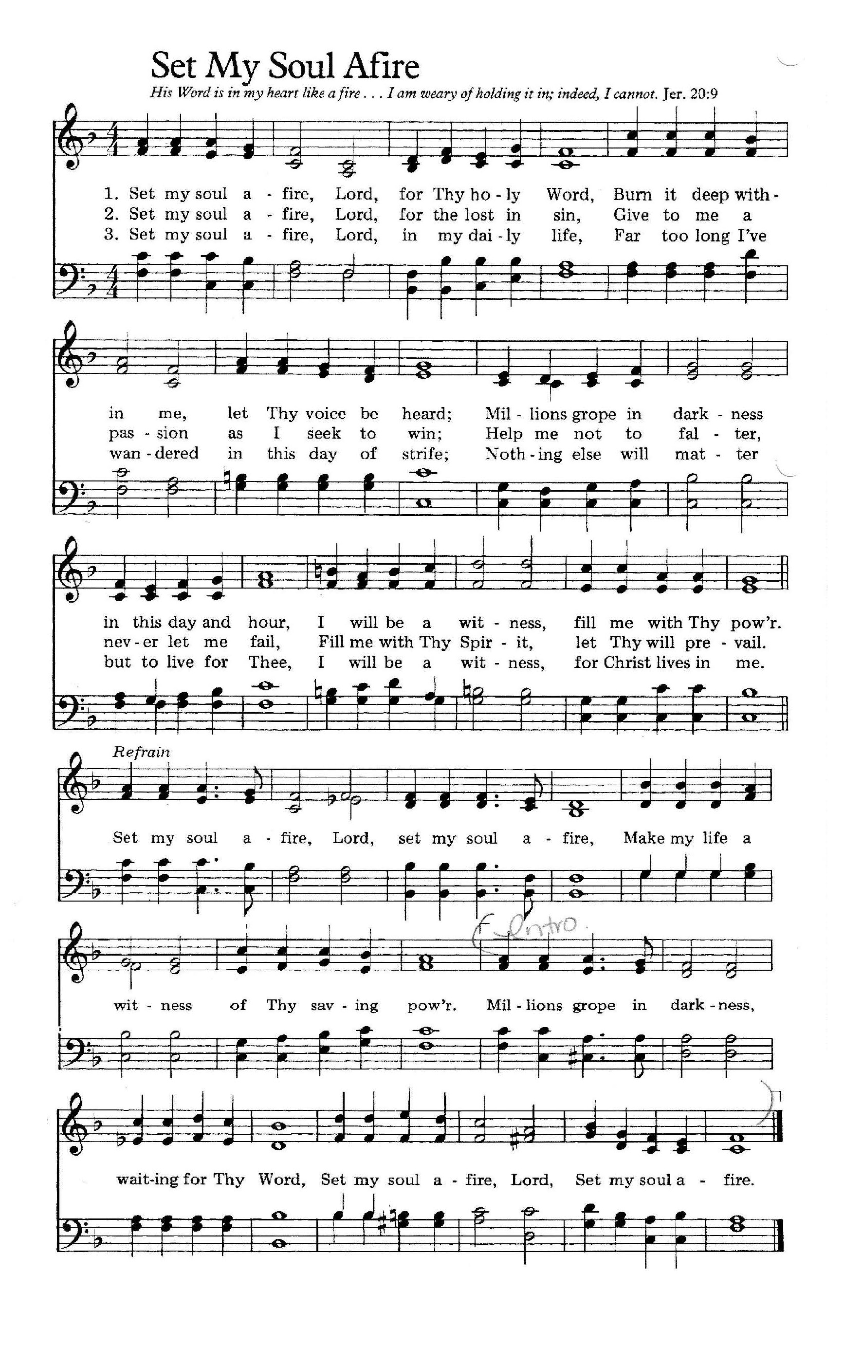 “Set My Soul Afire” by Gene Bartlett is a stirring prayer hymn from 1961 that calls believers to renewed passion, deeper commitment, and bold witness for Christ. Its message touches the core of Christian devotion by reminding worshippers that a life touched by God should also be a life ignited by God. The hymn captures the longing every believer feels when spiritual warmth begins to cool, offering a heartfelt plea for God to reignite that inner flame.