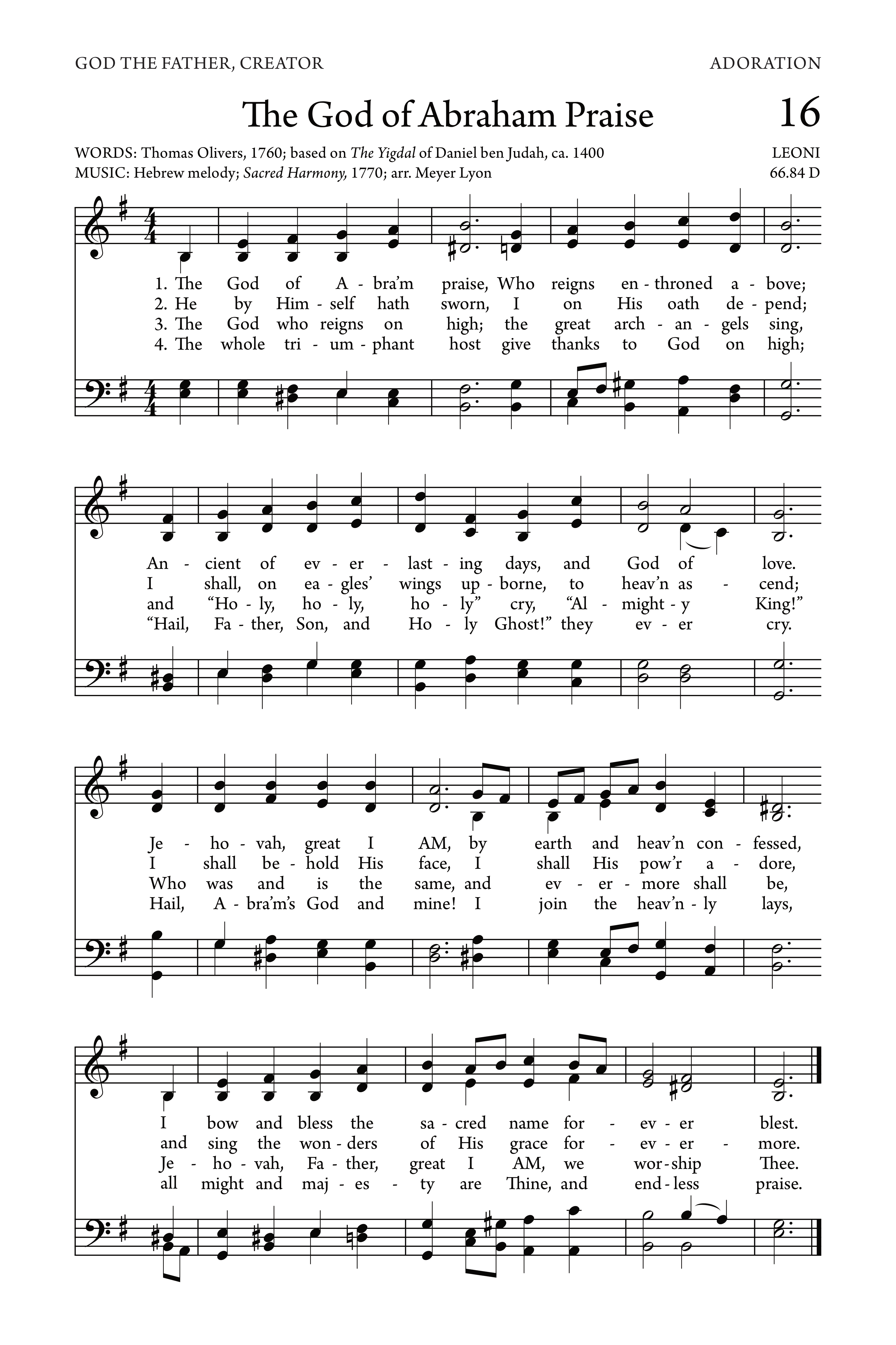 Though Olivers wrote several hymns during his lifetime, only one remains in common use today—his stirring hymn known by its opening line, “The God of Abraham Praise.” This hymn has long been considered by hymnologists as one of the finest examples of English hymnody. The inspiration for it came from a visit Olivers made to the Duke’s Place Synagogue in Aldgate, London. There he listened to a Jewish rabbi expound on the Hebrew Scriptures, and he also heard Meyer Lyon (also known as Leoni), a celebrated Jewish cantor, sing the Yigdal, a doxology based on the thirteen articles of Jewish faith. The Yigdal, written in the 14th century by Daniel ben Judah, is a significant part of Jewish liturgy and is a declaration of belief in the core doctrines of Judaism. Olivers was deeply moved by the beauty and depth of the service, particularly the music. So inspired was he that he composed a Christian paraphrase of the Yigdal, setting his newly written text to the melody he had heard. He named the tune “Leoni” in honor of Meyer Lyon, the cantor whose voice and music had left such a lasting impression.