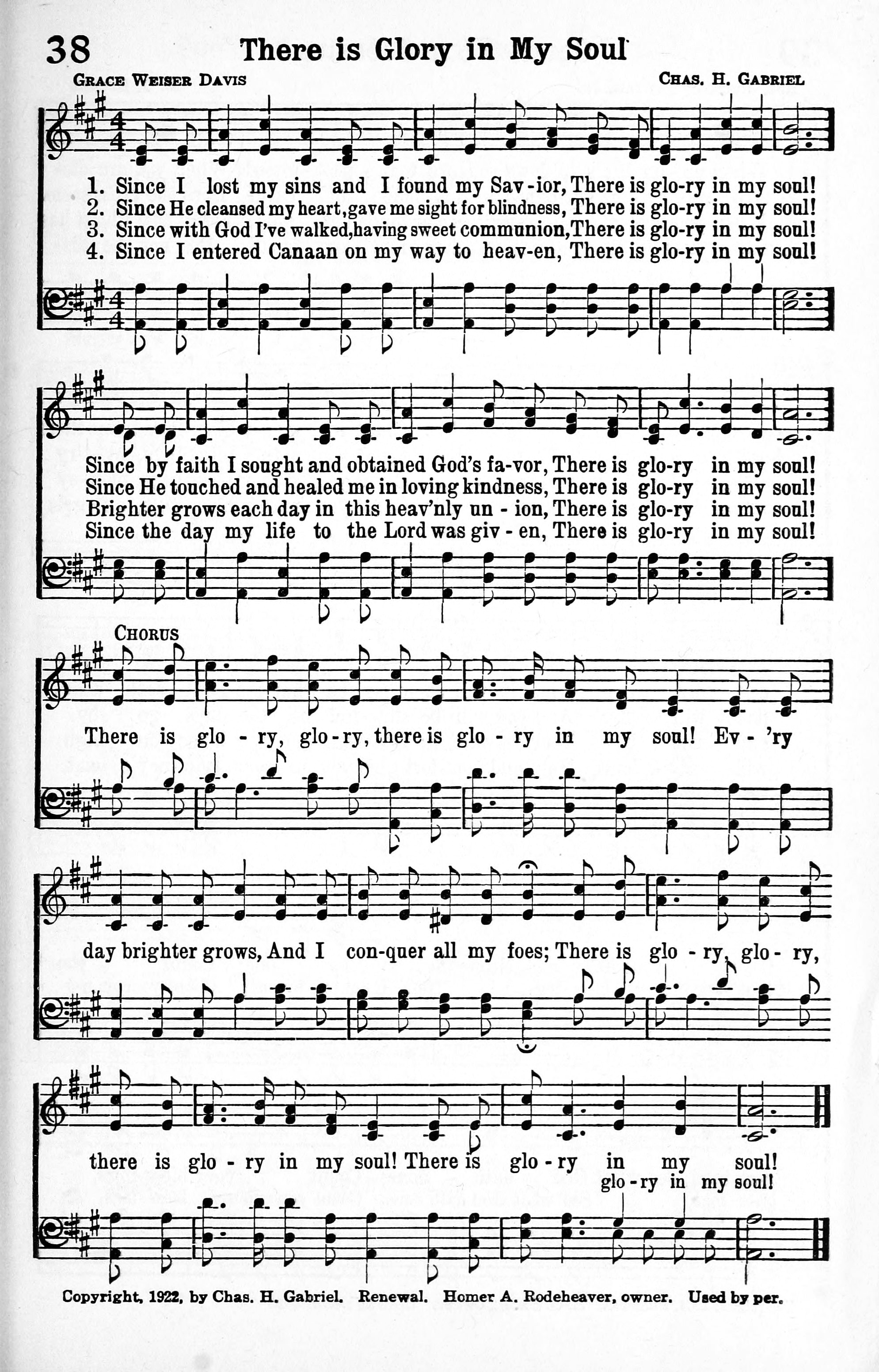 The song opens with an expression of deep inner joy, reflecting the transformation that takes place when a sinner finds forgiveness and peace through Christ. Its theme is not earthly glory but the spiritual glory that fills the soul when one is reconciled to God. The repeated declaration “There is glory in my soul” serves as both testimony and encouragement, a way of proclaiming to others the reality of salvation and the indwelling presence of the Holy Spirit.